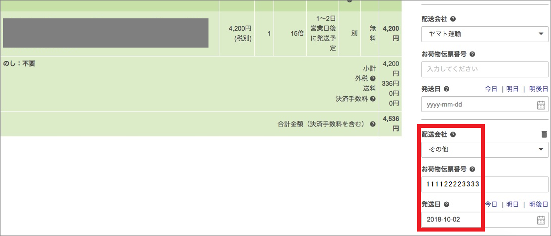 ① 2段目に反映されている「配送会社」「お荷物伝票番号」「発送日」を1段目に手動入力にて移して頂く