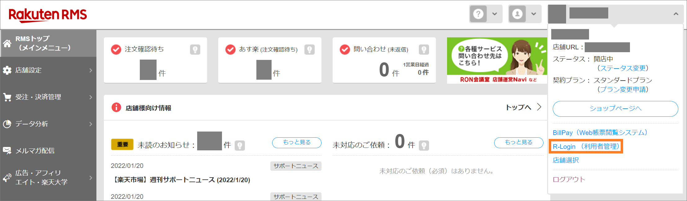 ① 楽天RMSへログイン後、「R-Login」へ進みます。