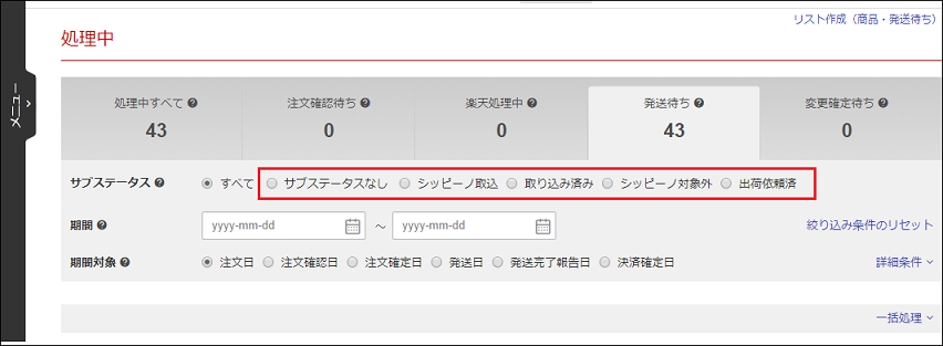 楽天ペイ受注一覧にて「発送待ち」ステータスに遷移した受注の中で、